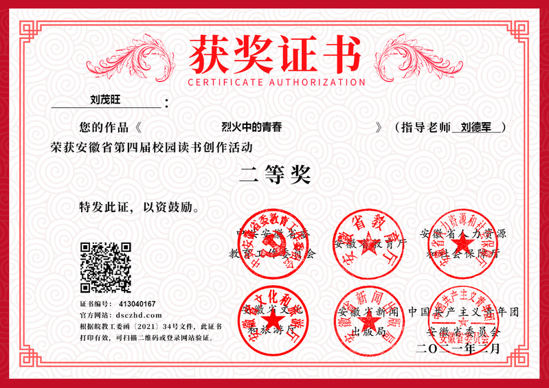 近日,由中共安徽省委教育工委、安徽省教育厅等部门共同举办的安徽省第四届校园读书创作活动获奖名单公布,马克思主义学院王晓玉同学创作的《青年——在敬畏中成长》荣获一等奖,刘茂旺同学创作的《烈火中的青春》荣获二等奖。