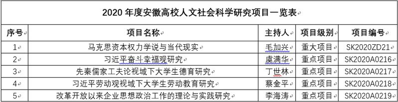 根据《安徽省教育厅关于2020年度高校科学研究项目申报工作的通知》(皖教秘科[2020]72号),经学校组织申报、评审、公示无异议和省教育厅审核批准,现将2020年度高校科学研究项目予以公布: