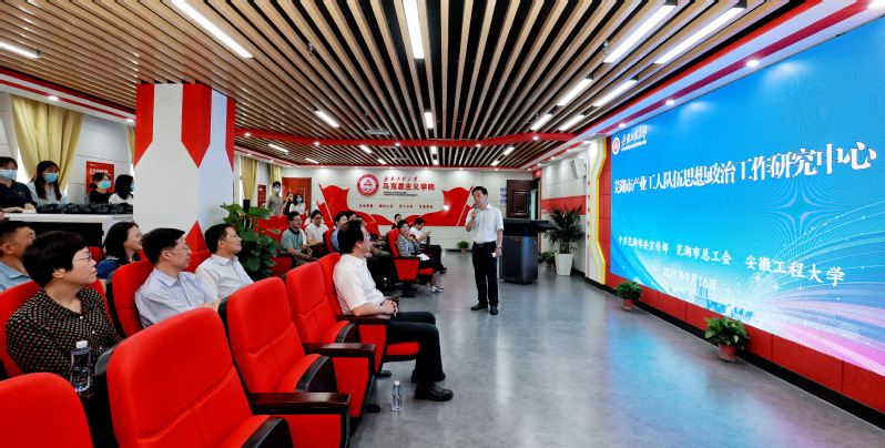 研究中心管理委员会主任苏国红代表研究中心作工作汇报。她介绍了中心的设立缘起、筹备经过和基本情况,汇报了中心的工作进展和未来工作展望。她指出,中心的设立,是贯彻中央重大决策部署,推进政校合作共赢,体现学校办学定位和彰显学科特色的重要举措。在安徽省总工会、中共芜湖市委宣传部、芜湖市总工会和学校主要领导的大力支持下,中心设立时间虽不足半年,但已开展大量工作。未来,中心将围绕产业工人队伍思想政治工作,在思想政治状况调研,理论研究和案例总结、提炼、推广,以及构建校企一体化的思想政治教育体系,建立产业工人队伍思想政治工作数据库,开发评估与测评产业工人思想政治状况量表等方面加强建设。她希望,各级领导能够继续关心、支持研究中心的发展。