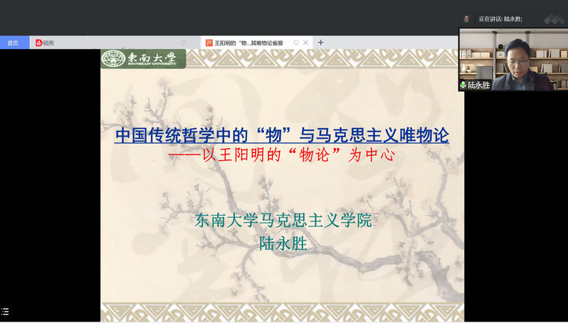 4月28日下午,江苏紫金文化社科英才、东南大学马克思主义学院陆永胜教授受邀为马克思主义学院全体专兼职思政课教师和研究生,作题为“中国传统哲学中的‘物’与马克思主义唯物论:以王阳明的‘物论’为中心”的专题报告。本场报告是今年马克思主义学院学术活动月的第三场报告,报告采用腾讯会议形式。马克思主义学院刘聪教授主持报告会。