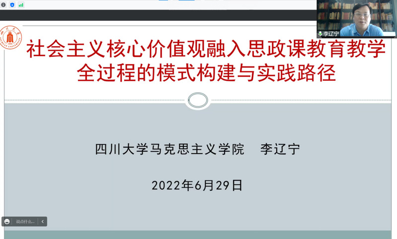 会议分两个阶段进行。会议第一阶段为主旨报告,由李红星主持,李辽宁教授和王建华教授分别作主旨报告。李辽宁教授以“社会主义核心价值观融入思政课教育教学全过程的模式构建与实践路径”为主题,从“社会主义核心价值观的多维样态”“社会主义核心价值观融入思政课教育教学全过程的模式构建”“社会主义核心价值观融入思政课教育教学全过程的实践路径”三个方面进行了详细论述。他指出,社会主义核心价值观既是一种价值理念,也是一种理论体系、制度约束和行动指南,我们要通过理论灌输式、情感渗透式、制度规范式和活动体验式等方式将社会主义核心价值观融入思政课。社会主义核心价值观融入思政课全过程需要在加强顶层设计,聚焦关键环节,加强队伍建设和强化制度协同等方面持续用力。王建华教授基于对政党与现代国家的分析框架,分析了民初政党政治失败的原因及其军政、训政、宪政的困境,深入阐释了中国特色政党制度生成的理论与实践逻辑。他强调,回首百年中国特色政党制度生成的理论与实践逻辑,我们能够发现,现代化国家建设的任务推动中国政党制度的成长,中国特色政党制度是基于中国历史与中国社会发展的逻辑必然。