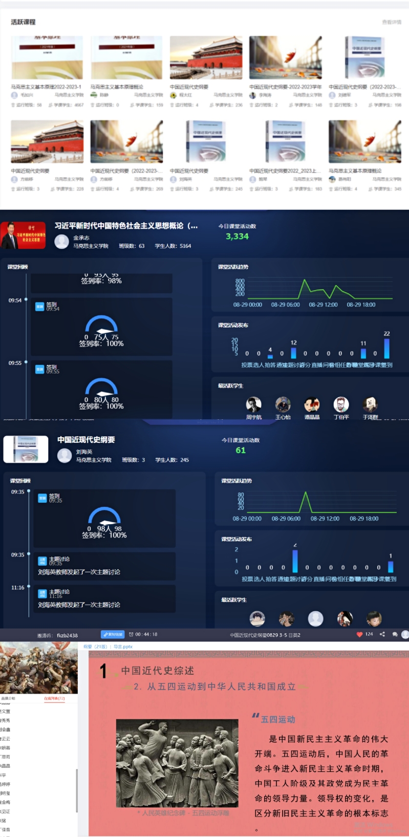 开学前,马克思主义学院对开学工作进行了精心部署,对教学资源进行了集体审查,对教学工作提出了具体要求。整体上看,开学第一天,线上教学秩序井然。教师备课充分,精神饱满,学生出勤率高,积极参与,达到应有的教学效果。