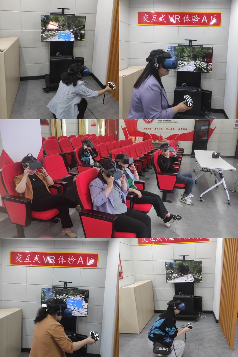 会后,与会人员一同参观了学院的文化墙和思政课VR虚拟仿真实践教学中心,谢建一行体验了沉浸式和交互式VR虚拟仿真实践教学设备。