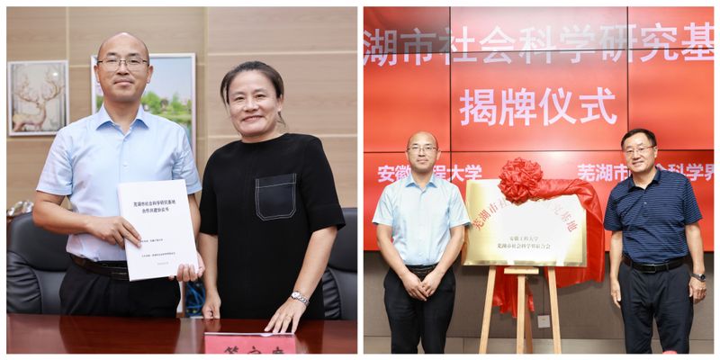 在全场热烈的掌声中,吴月红、王建明分别代表双方单位签订了《芜湖市社会科学研究基地合作共建协议书》。孙浩然、王建明共同为“芜湖市社会科学研究基地”揭牌。
