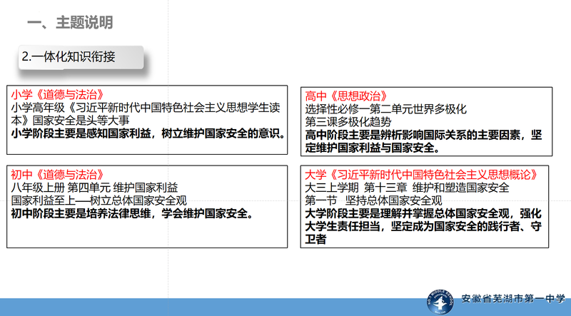 为贯彻落实习近平总书记对学校思政课建设的重要指示精神,深化大中小学思想政治教育一体化建设,积极探索不同学段循序渐进、螺旋上升地讲好思政课、讲活思政课的策略和方法,根据芜湖市大中小学思政课一体化共同体工作部署,10月15日下午在芜湖市第一中学开展了大中小学思政课一体化共同体集体备课成果交流展示活动,研讨活动由芜湖市龙湖中心小学章如兴老师、芜湖市第二中学陈春辉老师、芜湖市第一中学吴霞老师、我校思政课教师杨孝旭老师就“国家利益与国家安全”教学专题进行了教学展示。