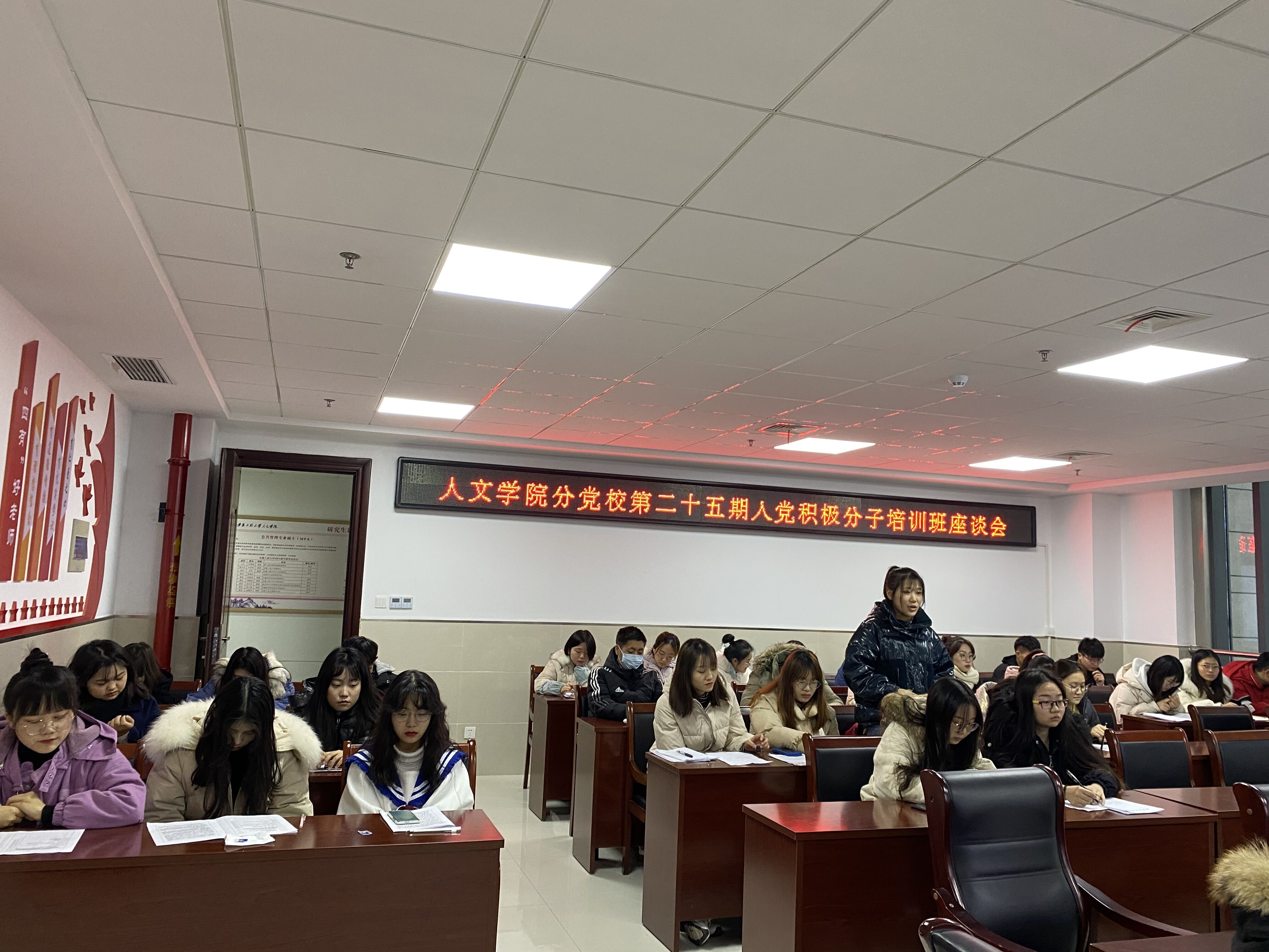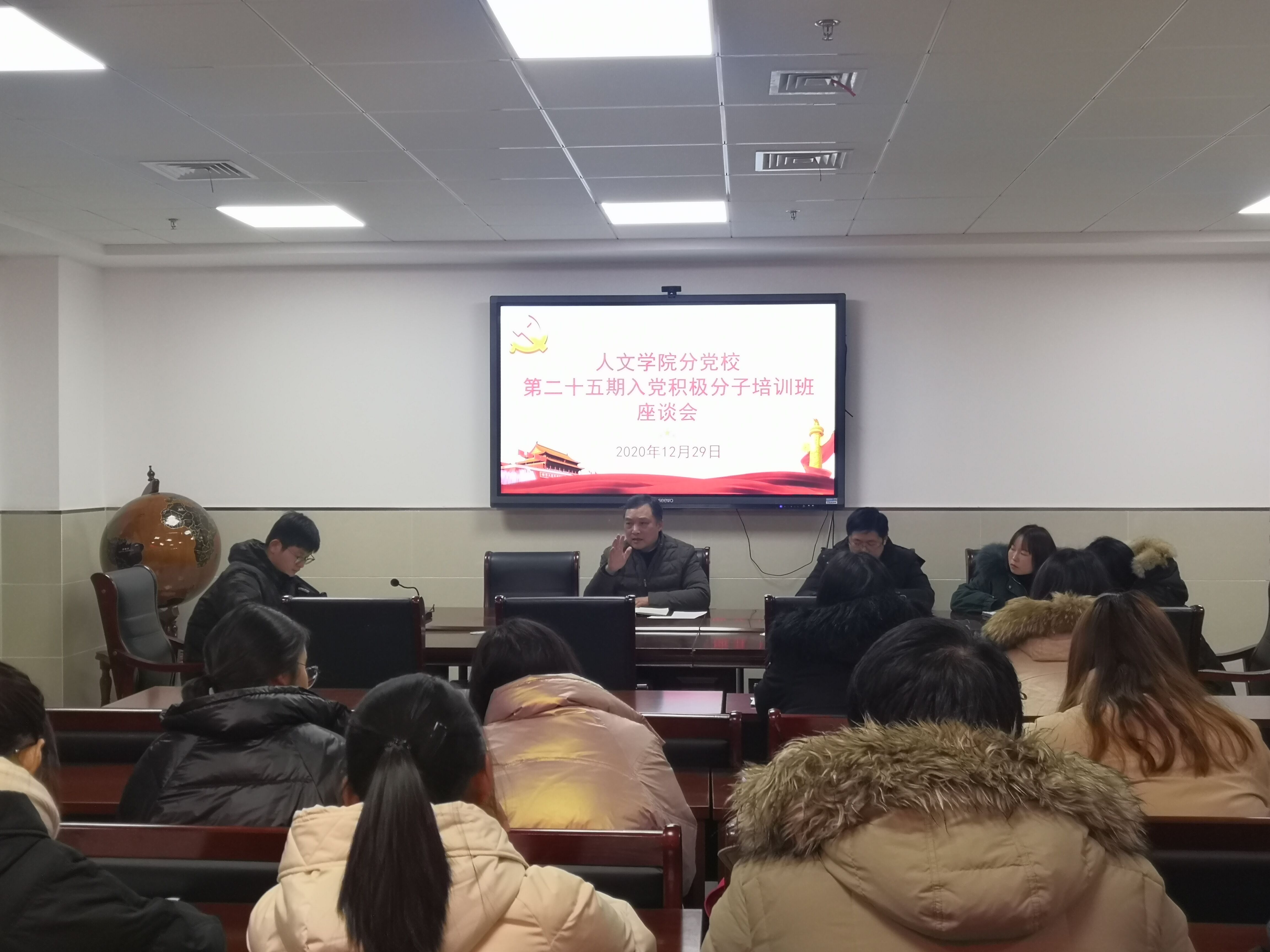 为了进一步深入学习贯彻习近平新时代中国特色社会主义思想,切实巩固入党积极分子培训班学员理论学习成果,2020年12月29日下午,人文学院分党校在图书馆1307会议室举行第二十五期入党积极分子培训班结业座谈会,旨在加强学院和学员之间更好地学习交流。院党委书记邓英扣、组织员、全体辅导员以及该班37学员共同参加座谈会。