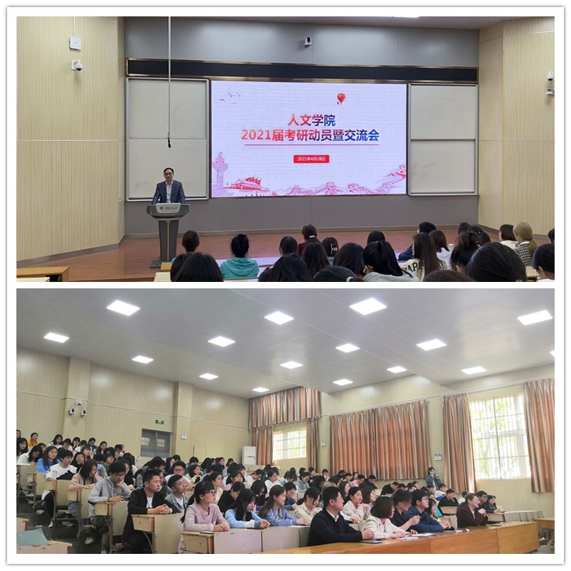 为进一步帮助我院学生深入洞悉考研态势,明确目标,掌握相关考研技巧,提高考研热情,营造积极向上学风,同时为学院正在努力备考的同学加油鼓劲,4月28日下午,人文学院2021年考研动员暨交流会于2教报告厅召开。人文学院院长刘军,党委副书记金艾裙,组织员、团委书记,全体辅导员、2021届优秀考研学生及2022届全部学生参加,会议由金艾裙主持。