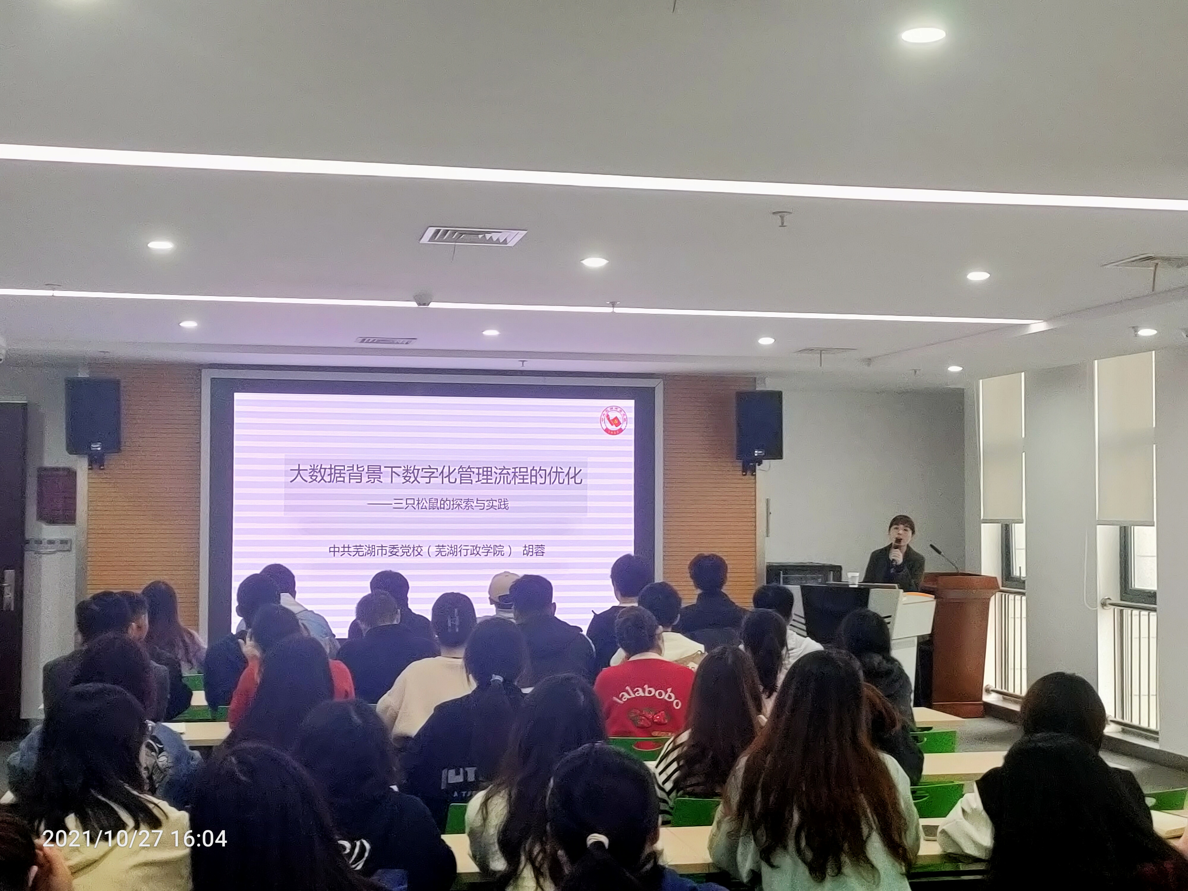 为拓展学生专业视野、增强学生专业认知,培养学生的专业思维和创新意识,10月27日,中共芜湖市委党校(芜湖行政学院)教务科研处副处长胡蓉博士,应邀来人文学院“公管论坛”,作了题为“大数据背景下数字化管理流程的优化——三只松鼠的探索与实践”的学术报告。部分教师、行政管理专业本科生80余人参加了此次报告会。报告会由人文学院副院长周伟主持。