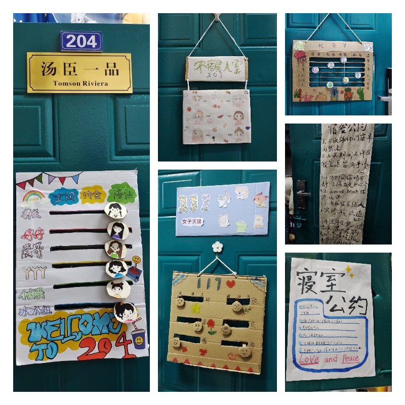 下午15:30由学院团委书记、新生辅导员、各班生活委员组成的评委组进入宿舍,围绕宿舍卫生状况、宿舍内部设计和文化创新创意三个方面对各宿舍进行打分。同学们用自己的双手点缀宿舍,用创意丰富生活,用创意构思打造属于自己的独特、温馨、舒适的家。用毛绒编织玩具、清新植物、卡通动漫、书画作品等元素别具匠心地设计和装饰着大学生活的“港湾”。同学们自己设计的宿舍logo,劳动任务清单、劳动公约更是展示了各个宿舍独特的“个性”,为干净、整洁的宿舍增添一抹亮色。