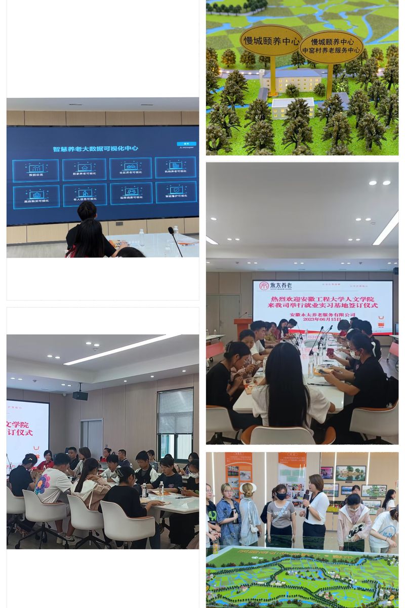6月15日下午,学院党委副书记王中江、社会工作系教师孙丽、梁琛琛带领同学们来到安徽永太养老服务有限公司二分院(芜湖市湾沚区六郎慢城颐养中心)进行了参观学习。机构负责人汪佩向师生介绍了慢城分院的发展历程,并带领同学们参观了养老院内基础设施及各功能室。在座谈交流中,同学们就养老院发展、社会工作与养老等问题与机构老师进行了互动。最后,同学们共同见证了人文学院与安徽永太养老服务有限公司签署就业实习基地的签订仪式。