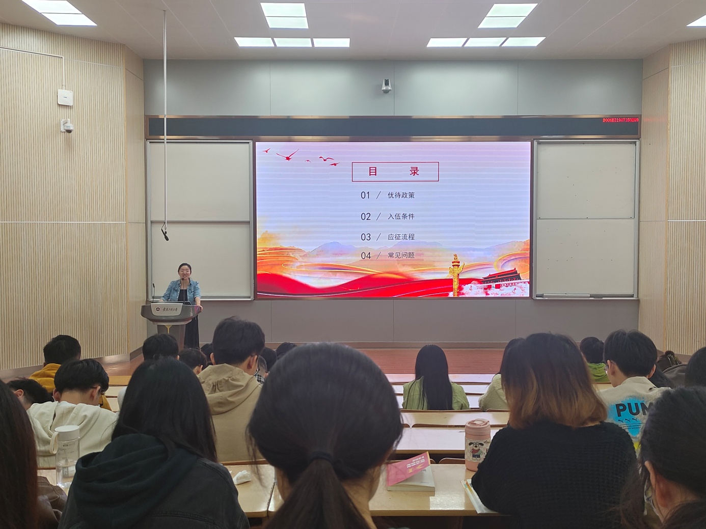 会上,赵成婧围绕大学生征兵的政策、应征入伍条件、报名流程、注意事项、参军入伍优势、职业发展、优抚优待、就业升学等方面进行了全面分析和解读。并重点讲述了退伍后的退役士兵考研、事业编、公务员、部队文职等专项计划等同学们关注的相关问题。她表示,参军入伍是每个公民应尽的光荣义务,希望能有更多的同学将个人理想与国家命运紧密相连,积极投身热血军营。