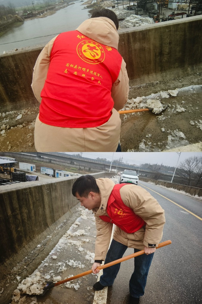 28日,在安庆市宿松县河塌乡,法学212贺行郑主动申请加入当地退役军人志愿服务队,疏导交通、排查道路交通安全隐患,全力以赴地投入到抗冰雪、保安全、保畅通工作中。