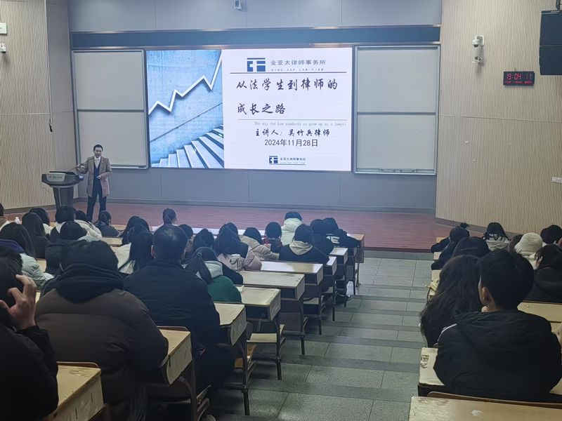 11月28日晚上,法学系邀请安徽省律师行业优秀共产党员、安徽金亚太(芜湖)律师事务所吴竹兵律师为同学们开展专业认识实习讲座。吴竹兵以“从法学生到律师的成长之路”为主题,重点围绕律师职业的角色定位与属性、律师执业初期的挑战与应对、律师职业能力的提升与发展三个方面进行讲解与经验分享,帮助学生了解律师职业,明确未来的职业发展方向。吴竹兵律师鼓励同学们注重专业知识的学习和综合素质的提升,努力成为德才兼备的高素质法治人才。