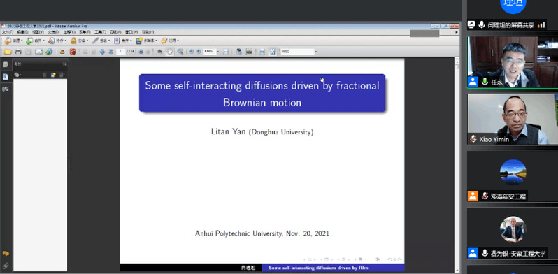 闫理坦教授作了题为《Some self-interacting diffusions driven by fractional Brownian motion》的报告,考虑了由分数布朗运动驱动的一类随机微分方程的自交互扩散问题,回顾了此类方程的研究背景,并且给出了其主要结果,包括研究了线性交互、带有紧支持的有界交互、持续交互等。