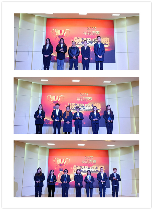 学院2021年度“华彩青春”颁奖盛典在精彩的开场舞表演后首先拉开帷幕。2021年,学院获得国家级奖项32项,省级奖项36项,学院根据获奖情况综合考量,评选出11名“闪光青年”“有为青年”,金融191团支部获评“青苗集体”荣誉称号。到场领导老师为他们颁发了定制的奖杯与证书。