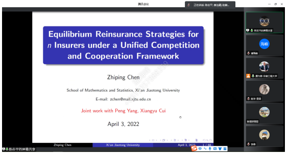 陈志平教授作了题为《Equilibrium reinsurance strategies for n insurers under a unified competition and cooperation framework》的报告,考虑多个保险人之间竞争与合作的关系,在连续动态框架下构建了理论模型,并进行仿真模拟、给出了具体的经济学含义,系统探讨了再保险的最优策略问题。