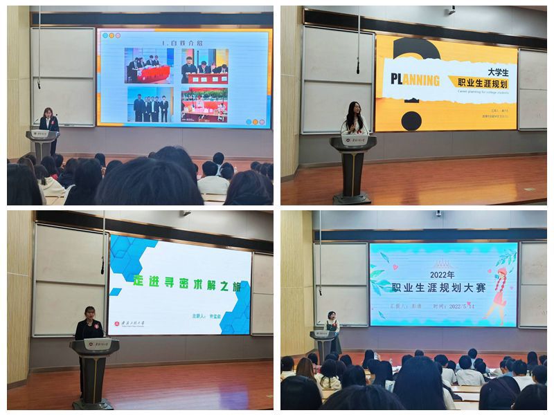 经过初赛遴选,共有10名选手脱颖而出入围决赛。决赛包括个人职业规划PPT展示与陈述、《职业生涯规划书》评分、和现场答辩三个环节。比赛中,参赛选手轮流上台,自信大方、各具特色地向现场师生展示了个人职业生涯规划,他们通过MBTI性格职业测试、霍兰德职业兴趣测试及SWOT分析等方式,理性客观地进行自我分析、环境分析,准确做出适合自己、自我期望的职业决策和职业通道设计,并在此基础上详细阐述了各个阶段的目标和实施方案。选手们在陈述自我认知中踊跃表现个人魅力,在讲述个人规划时积极展现个人能力。