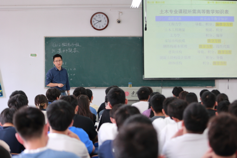 梁勇讲授的内容是《高等数学(下)》第十二章:微分方程。首先围绕土木专业课程所需高等数学知识点展开,列举了微分方程在土木专业课中的应用,凸显了微分方程在专业后期学习的重要性。随后通过求曲线方程和火车刹车问题两个引例,引入了微分方程,并且详细讲解了微分方程里的各种概念以及分类,最后利用两个例题使学生加深了对微分方程概念的理解。梁勇在教学过程中和学生充分互动、重难点突出、课堂讲授内容娴熟、语言表达清楚、理论结合实际,整节课学生精神饱满,认真听课,课堂纪律好,教学效果佳。