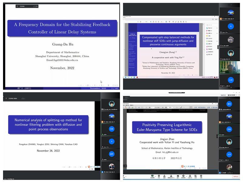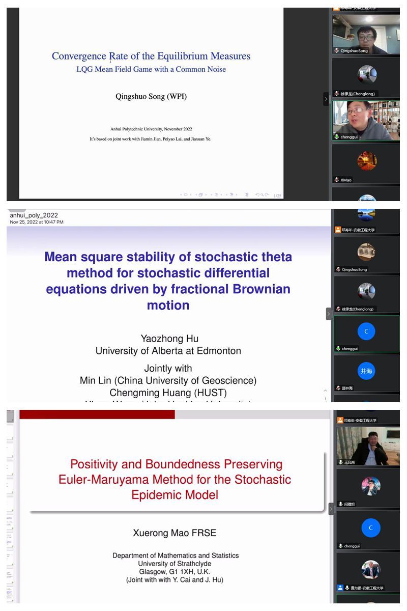 26日晚的报告会由东华大学闫理坦教授、上海财经大学徐承龙教授、英国斯旺西大学袁成桂教授、天津大学王凤雨教授主持。北京理工大学席福宝教授分享了题为《Regime-Switching diffusion processes with infinite delay》的报告;天津大学邵井海教授在报告中探讨了具有状态依赖切换的随机混杂系统的遍历性和稳定性的充分条件;武汉大学刘伟教授和澳门大学徐礼虎副教授分别以《Uniform Poincare inequalities and logarithmic Sobolev inequalities for mean field particle systems》和《The convergence rate of the equilibrium measure for the LQG mean field game with a common noise》为题进行专题报告;美国伍斯特理工学院宋庆硕副教授在报告中针对平均场博弈问题探讨了平衡点测度的收敛速率;加拿大阿尔伯塔大学胡耀忠教授在报告中探讨了由分数阶布朗运动驱动的随机微分方程随机Theta方法的均方稳定性;英国思克莱德大学毛学荣教授分享了题为《Positivity and boundedness preserving numerical scheme for the stochastic epidemic model》的报告。