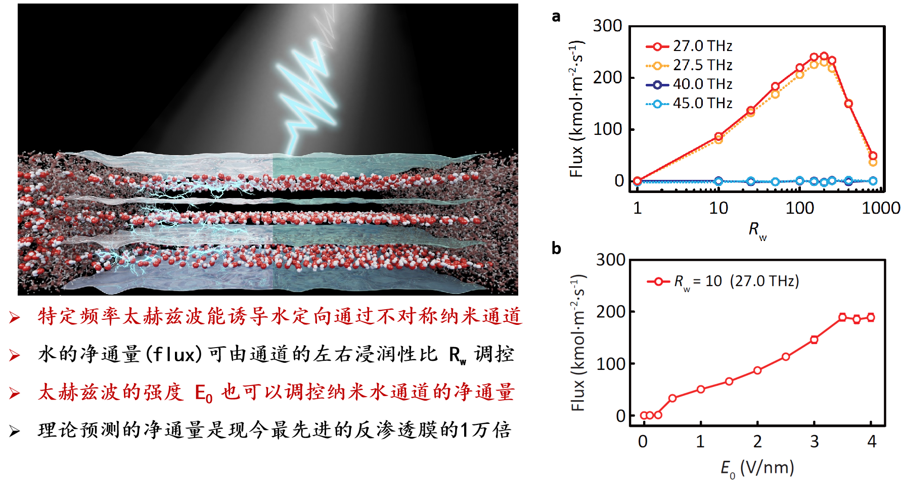 在纳米世界里,操控大规模水单向传输是一个巨大挑战,这是因为水分子是电中性且无磁矩,电场或磁场都无法驱动其单向流通。基于课题组前期研究成果 [Phys. Rev. Lett. 110, 254501 (2013);Nanoscale 8,1886(2016);Phys.Rev.Fluids 7,114202(2022)] 和生物主动输运机制的启示,在本研究中,团队成员通过模拟太赫兹频率的光辐照到左右不对称的二维纳米水通道上,发现特定频率的太赫兹辐照能诱导通道内受限水单向流通,其最大水通量能达到先进反渗透膜的1万倍左右。该工作开辟了太赫兹技术调控实现泵水通过纳米通道的新路径,首次提出“太赫兹光的不对称吸收引起能量流”这一光控水输运的物理机制。由于太赫兹波具有长程可控、高效无损和生物兼容等优点,该太赫兹供能的棘轮式分子泵机制不仅有望能应用在生物医学和过滤膜领域,帮助实现水和离子在生物/纳米通道中的高效精准输运, 同时也能进一步拓展太赫兹技术在过滤、脱盐、蒸发、能量转换和生物调控等领域的综合应用。研究工作得到了国家自然科学基金、安徽高校自然科学研究重点项目,以及芜湖市科技项目的资助。