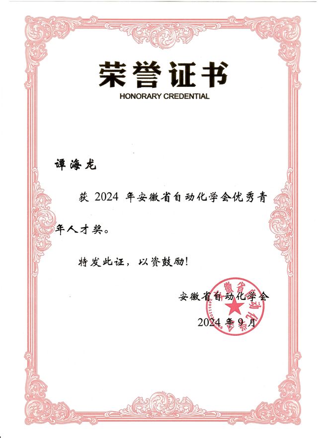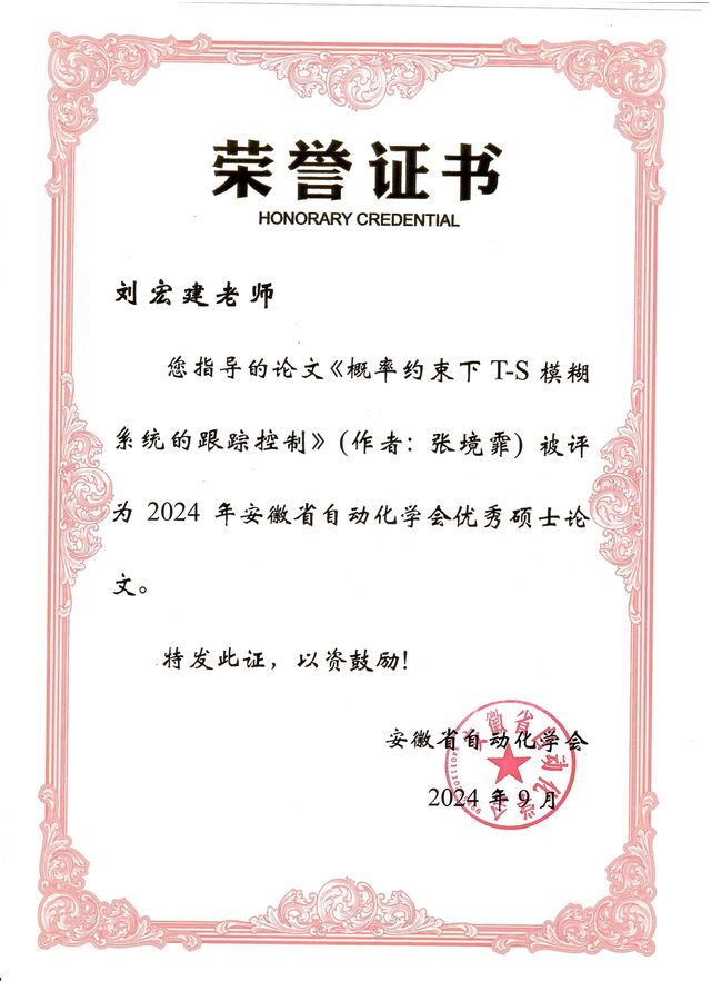 近日,由安徽省自动化学会主办的“2024年安徽省自动化产业与技术大会”在泾县隆重召开。会上公布了我省高校自动化领域的多个重要奖项,我校系统科学学科谭海龙副教授荣获2024年度安徽省自动化学会优秀青年人才奖,系统科学首届硕士毕业生张境菲的论文《概率约束下T-S模糊系统里的跟踪控制》荣获优秀硕士论文奖。