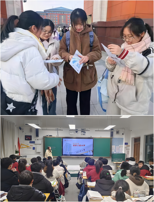 情怀家乡勇攀高峰。学院组织六支招生宣讲团队开展“再回母校”返家乡招生宣讲活动,其中2023级新生郑心愿、吴悦两支团队先后前往六安一中和金寨一中。宣传团队运用优美的PPT详细介绍了安徽工程大学优越的招生政策,结合建校88周年宣传片向学弟学妹们介绍了优美的校园环境和雄厚的师资力量。通过这次活动,加深了与高中母校的老师及学弟学妹们的联系,得以重温在高中母校的时光,分享自己的备考经验,用自己的优异成绩与母校共同成长。