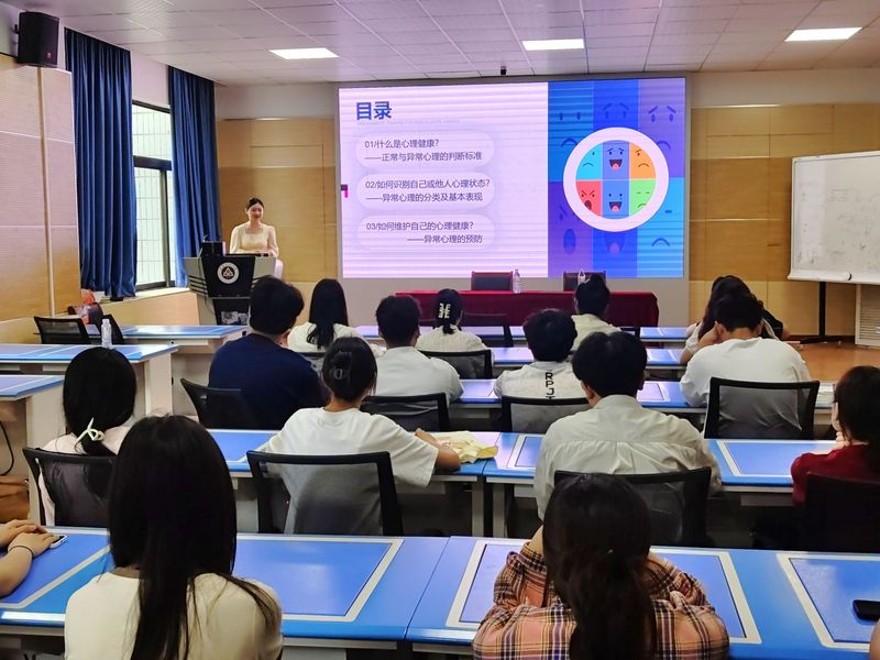 讲座伊始,李梦菊从什么是心理健康开始引入,为大家讲解了“大学生异常心理的察觉与应对”专题,介绍了当前大学生心理健康问题的普遍状况,如何识别自己和他人的心理问题,并分析大学生群体面临的心理压力来源。接着,深入剖析大学生心理健康问题的原因,她指出,学业压力是导致大学生心理问题的主要因素之一。