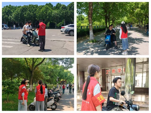 志愿者在主干道交叉口实施动态管控,协助保卫处老师疏导交通,面向师生开展一盔一带宣传教育。他们以实际行动践行党员志愿服务精神,展现出新时代研究生党员良好的精神风貌。