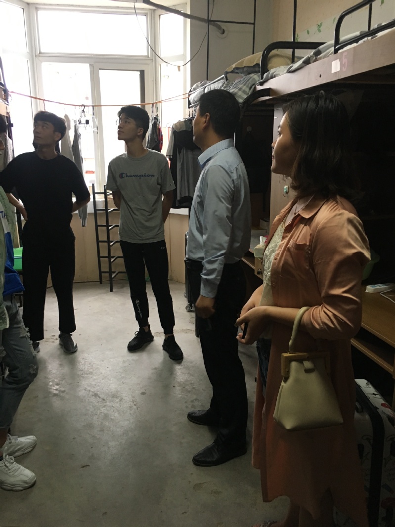 晚上5:00,学院领导、系主任等一行人走访了新生宿舍,查看了宿舍的环境、设施等情况,胡好还亲切问候了每一位新生同学,关心他们的思想、倾听他们的想法、耐心解答他们的疑惑,对他们提出殷切的希望,同学们都纷纷表示“院领导和老师们就像家长一样亲切,让他们感到了新家的温暖”。