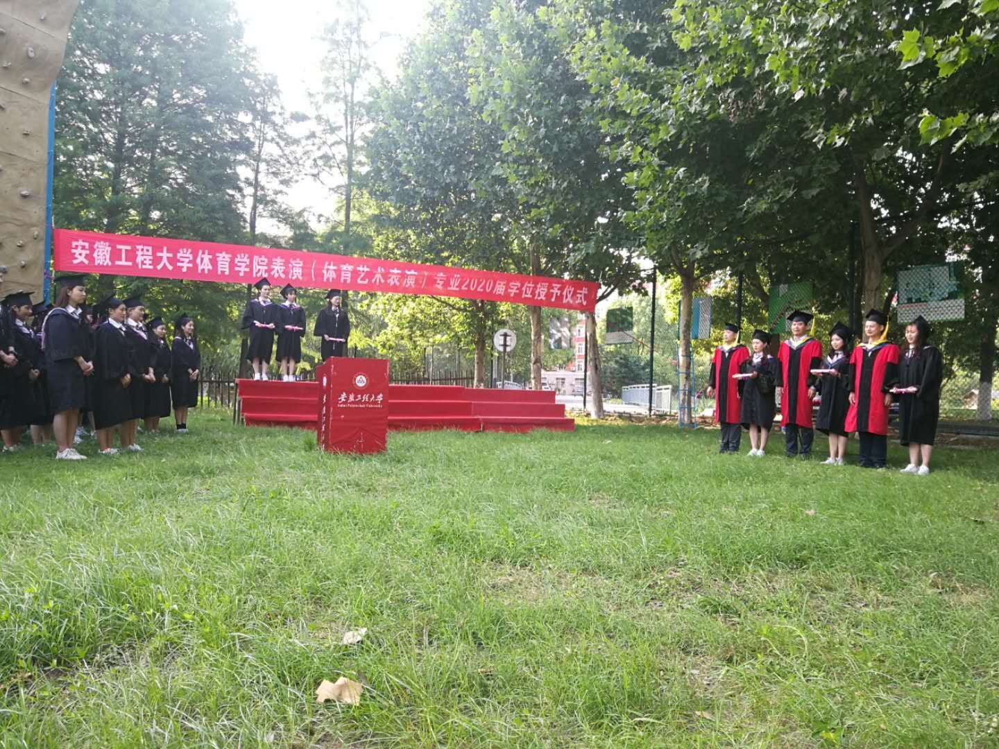 体育学院的毕业典礼一直是学院特色活动,受本次疫情影响无法像往年在师生活动召开,但是学院为了不给毕业生留有遗憾,在保证安全的前提下,在户外举办了一场小型简单却意义深远的仪式。