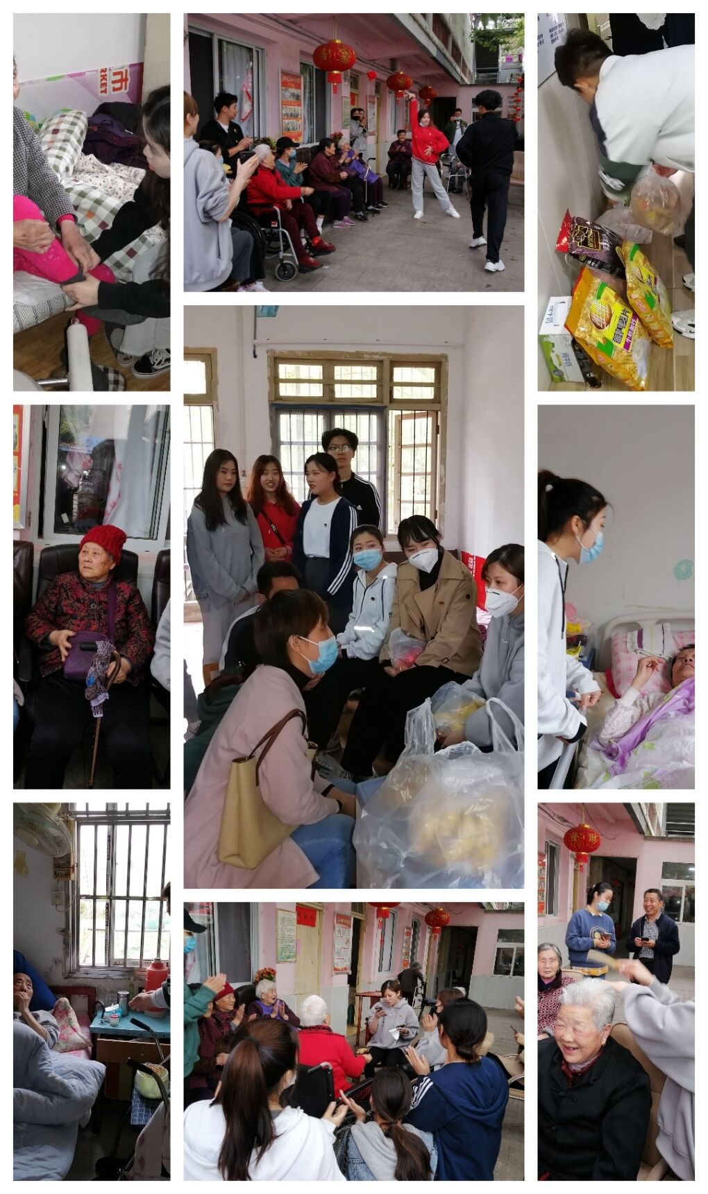 随后,同学们为老人梳理了头发、整理了衣服、打扫了卫生,和他们一起唱红歌,为他们送上了两段拉丁舞表演,老人与同学们一起拍手打节拍,哼着歌曲,扭动着身躯,气氛一片热闹祥和。
