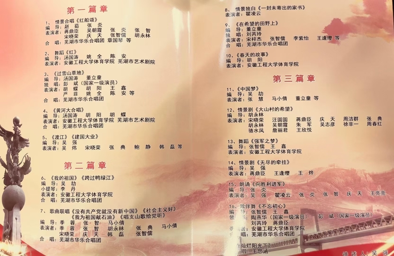 此台晚会以多个原创歌颂党、歌唱祖国的舞蹈、歌曲、合唱、配乐诗朗诵等作为主要内容,用史诗型篇章的方式,展示中国共产党建党100周年以来的丰功伟绩,我校体育学院学生前后分别展演歌舞作品有:《红》、《黄河大合唱》、《我的祖国》、《跨过鸭绿将》、《春天的故事》、《强军之梦》、《不忘初心》。