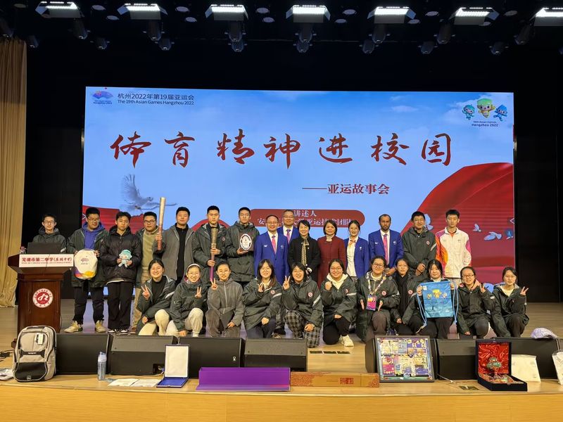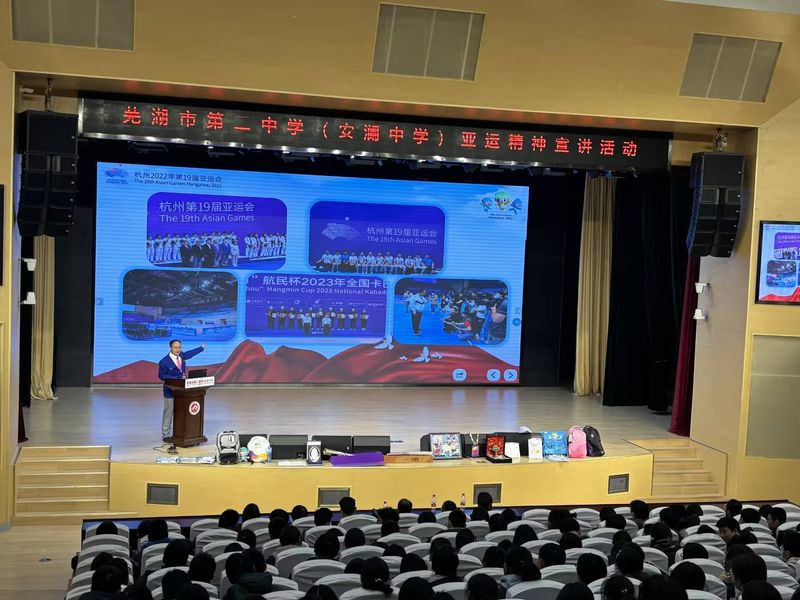 本次体验式招生宣传研学营是我校创新性的采取“双向体验”模式开展招生宣传工作,体育学院体验产业学院设计了以“体育精神进校园”为主题的宣讲活动,由参加亚运会工作的薛保红、李品仙、赵德勋、阿里和杨禹靖五人走进芜湖二中,面向300多名学生将宣讲体育精神,通过互动体验、观看视频、展示亚运会纪念物品等方式宣传我校体育教育成效和优势特色专业。