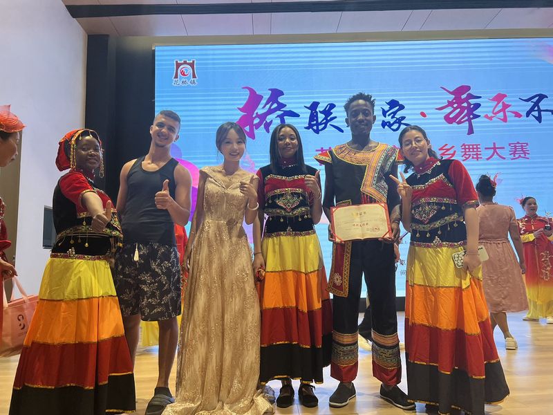 为确保作品的高质量呈现,此次三下乡由薛保红精心策划并全程指导。赛前,体育学院精心挑选了13名体育表演专业的学生围绕《活动策划》课程实践组成暑期“和美丰收,乡舞花桥”艺术助力乡村振兴志愿服务三下乡实践团队,担任各乡村艺术特派员,一对一负责13支参赛舞蹈队的日常训练和专业辅导。从基础舞步的矫正到舞蹈情感的表达;从创意编排到舞台效果的设计,同学们尽心尽力,精益求精,带领各乡村舞蹈队顺利完成上百次的赛前集训。比赛在旋律动听的音乐声中拉开帷幕,参赛的队伍精神饱满,神采飞扬,动作娴熟整齐,舞步轻快优美,充满着自强和自信。现场观众被精彩的表演所吸引,掌声雷动,叫好声、欢笑声此起彼伏,热闹的场面尽显新时代农民的良好精神面貌。值得一提的是,本届大赛上除了花桥镇12个村庄的本土舞蹈队伍,还迎来了一支由我校国际教育学院精心选派的外国留学生队。这支队伍的参赛,不仅为大赛增添了浓厚的国际色彩,更是象征着中外文化在乡村舞台上的精彩碰撞与融合。他们带着对中华文化的热爱与尊重,与当地村民一同排练,用独特的视角和创意,诠释着乡村舞蹈的无限可能。