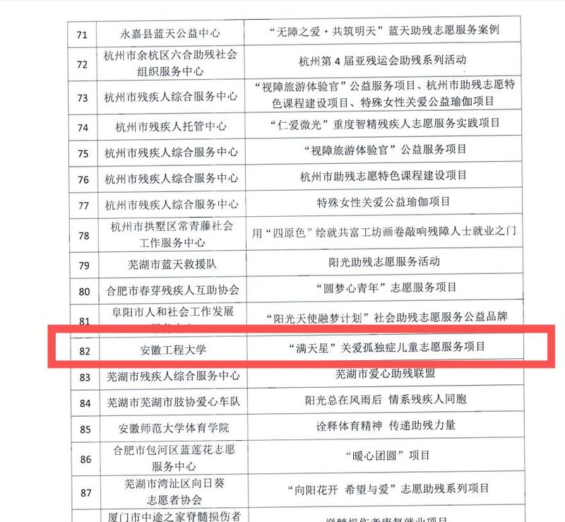 近日,在中国助残志愿者协会公布的关于认定“志愿者助残阳光暖百佳案例”决定中,由我校体育学院申报的“满天星”关爱孤独症儿童志愿服务项目被评为全国助残阳光暖百佳案例。在我校助残公益志愿服务工作中实现新的历史突破!