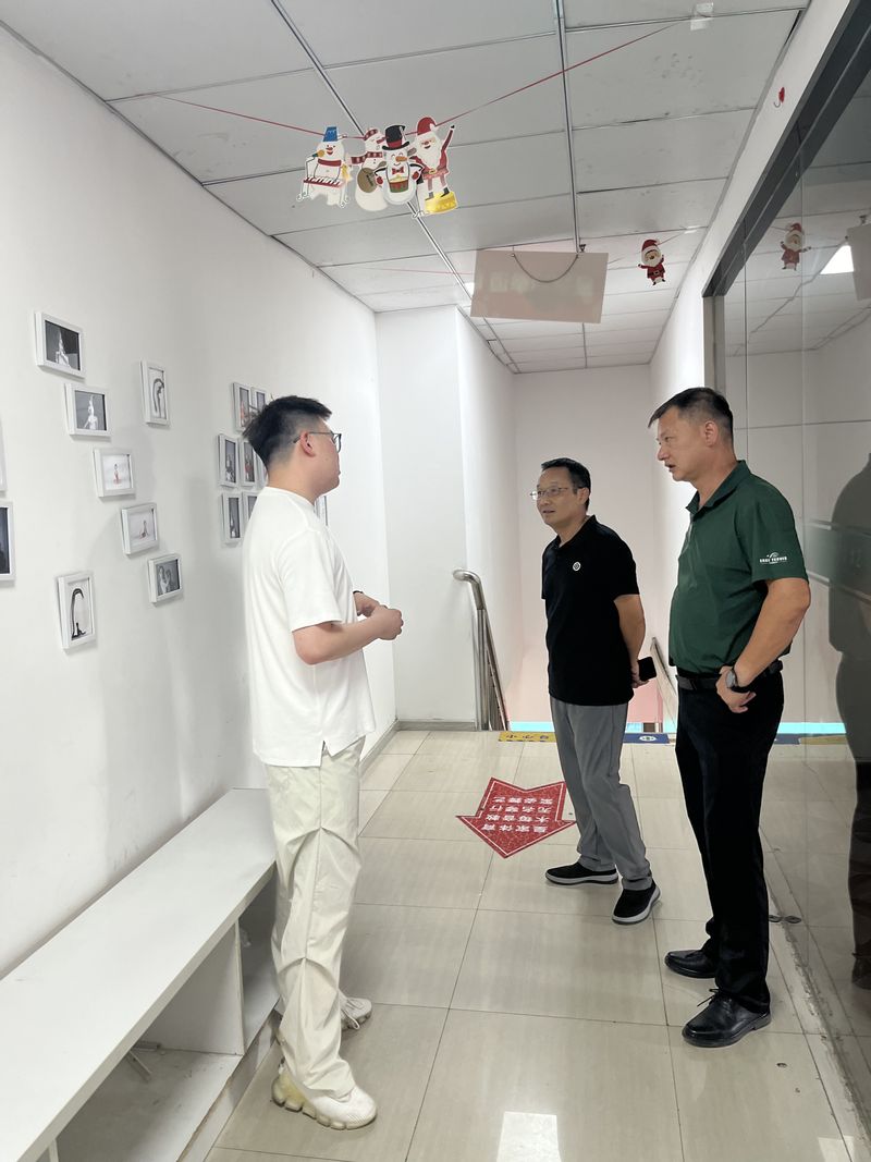 施禹涵陪同体育学院一行参观了培训学校的教学设施和成果展示,他结合自身经历介绍了公司经营、荣誉成果、人才需求、行业前景等概况,并表达了对母校的感恩及怀念之情,希望有优秀的学弟学妹到公司实习实践、就业发展。