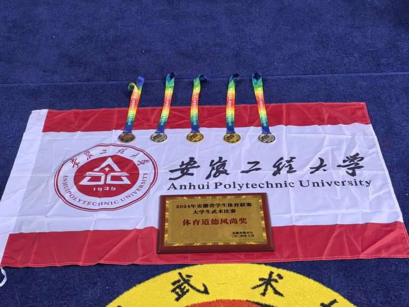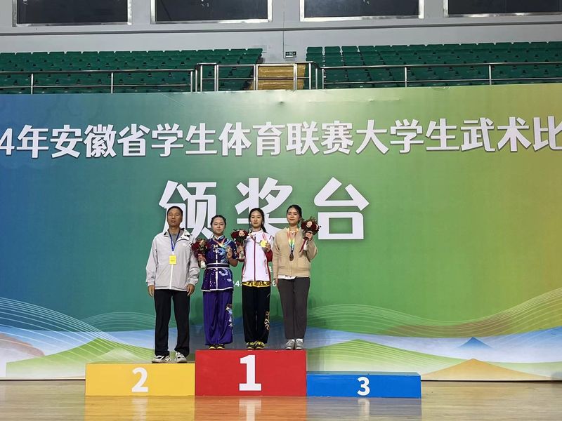 近日,由安徽省教育厅、安徽省体育局主办的2024年安徽省学生体育联赛大学生武术比赛在阜阳师范大学体育中心举行。本次比赛共有来自全省42所高校共355名运动员参赛。经过3天的激烈角逐,我校武术队以优异的成绩顺利完赛、载誉归来。共斩获2金、2银、1铜和7项第四名、多项前八名以及集体项目第二名的佳绩,并荣获“体育道德风尚奖代表队”等荣誉称号。