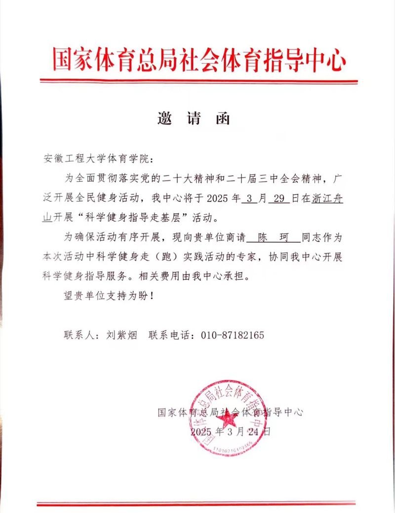 3月29日-31日,由国家体育总局群众体育司指导、国家体育总局社会体育指导中心主办的2025全国科学健身指导走基层(舟山站)暨舟山市全民健身月·全民体育生活节启动仪式在舟山市举行。受国家体育总局社会体育指导中心邀请,我校体育学院陈珂、杨玉杰、陈袁、钱雨涵四名研究生同学在导师薛保红、赵德勋的指导下,作为科普指导专家参与了活动的指导工作。活动中四名研究生同学结合社会体育指导方向学习的成果,独立编排了健身热身带操活动,并带领与会人员现场体验,通过理论讲解与实践示范相结合的方式,为舟山基层群众带来了科学、系统的健身指导,受到与会领导和群众的高度赞扬。