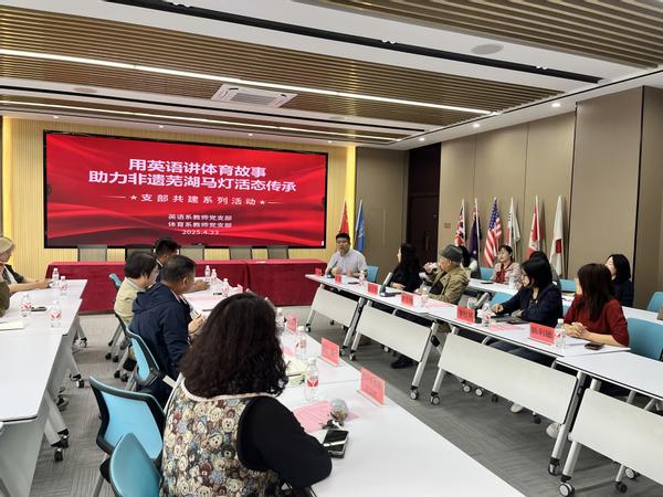 4月23日下午,体育学院体育系教师党支部与外国语学院英语系教师党支部在外国语学院9教209会议室联合开展党支部共建活动。本次活动以“用英语讲体育故事,助力非遗芜湖马灯活态传承”为主题,旨在打破学科壁垒,探索跨学科合作新路径,推动非遗文化传承和创新。