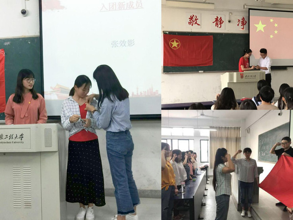 英语172、英语161团支部分别有5名同学经过了支部和院团委的严格审查,光荣地加入了共青团。各个支部分别开展了新团员入团仪式,院团委委员和各支部新老团员一起参加了活动。参加活动的院团委委员为新团员颁发了团员证,佩戴上团徽,表达了对新团员的美好祝愿和殷切期望。新老团员以宏亮的声音,面对鲜艳的团旗,一起庄严的宣誓:“我志愿加入中国共产主义青年团,坚决拥护中国共产党的领导……”