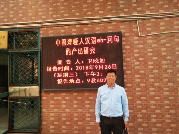 卫晓旭首先从功能语言学角度,结合二语习得理论探讨了中国聋生手语水平对汉语wh-问句产出的影响和不同语法功能的wh-词习得顺序,此研究对聋生汉语习得、手语教学和语言康复训练有一定的理论和实践意义。接着卫博士和大家一起分享了自己的考博历程及科研心得,用自己的亲身经历告诉大家,要想有所获,必须的拼搏。最后,黄焰结做了总结发言,指出卫博士的讲座给我们带来了两点启示:用西方理论来阐释中国语料;科研的创新意识。