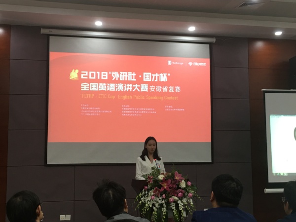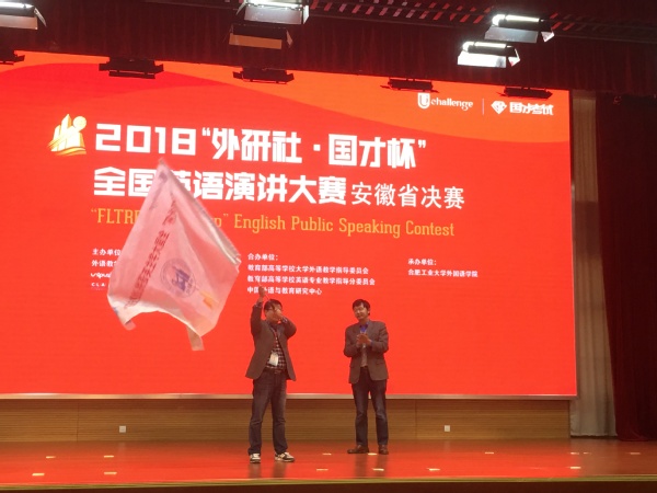 1026日至28日,“外研社·国才杯”全国英语演讲大赛(安徽赛区)在合肥工业大学举行。外国语学院英语专业16级选手汪珊同学荣获二等奖,生化学院孙梦同学获三等奖,参赛指导教师许庆美和李新国也分别获得相应指导教师奖。外国语学院副院长黄焰结教授应邀作为本次赛事评委,并在大赛闭幕式上,接过了大赛旗帜, 2019年“外研社·国才杯”全国英语演讲大赛(安徽赛区)将在我校举行。