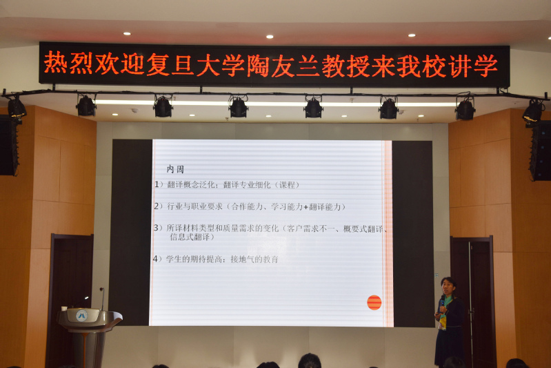 1121日下午,复旦大学外国语言文学学院翻译系主任、博士生导师陶友兰教授应我校邀请,C7楼报告厅为广大师生做了一场题为“人工智能时代翻译教育创新——从美国大学翻译课程设置谈起”的讲座。本次讲座由外国语学院、科技处和研究生部共同主办,外国语学院院长黄焰结主持。外国语学院全体教师与研究生以及部分本科生聆听了本次讲座。