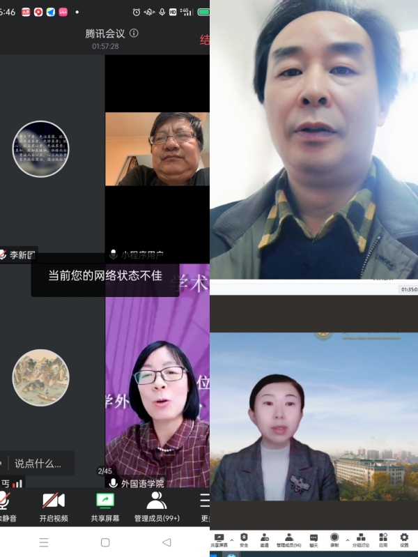 4月13日和14日下午,外国语学院在线上举办了学术活动月系列报告会。应外国语学院、科技处和研究生部的邀请,浙江大学胡志毅教授、华中师范大学苏晖教授作了学术报告。外国语学院金成星教授和唐雪梅教授分别主持了报告会。外国语学院部分教师、研究生及国内其他高校的师生近300人通过线上和线下相结合的方式聆听了报告会。