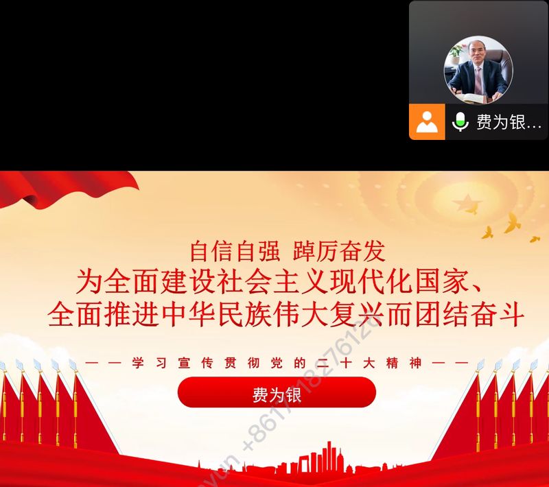 费为银以“自信自强 踔厉奋发 为全面建设社会主义现代化国家、全面推进中华民族伟大复兴而团结”为题,从“实践成就:十年来经历的三件大事是彪炳中华民族发展史册的历史性胜利;理论遵循:习近平新时代中国特色社会主义思想是马克思主义中国化时代化的重大成果;使命任务:以中国式现代化全面推进中华民族伟大复兴是党的目标重任;行动纲领:“三个务必”是坚定历史自信增强历史主动的必然要求;重要保障:自我革命是党跳出治乱兴衰历史周期率的第二个答案;精神品质:坚持发扬斗争精神是党战胜前进道路上困难和挑战的力量支撑”六个方面带领大家深刻领悟党的二十大报告精髓要义。