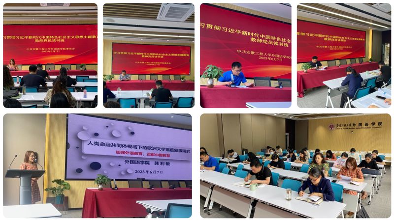 外国语学院党委高度重视政治理论学习,举办主题教育教师党员读书班跟进式融入式开展集中学习,通过“干部领学”“党员诵读”“案例研读”“交流研讨”“党性锻炼”等形式全面系统学、融会贯通学。对于党的二十大报告、党章、《习近平新时代中国特色社会主义思想专题摘编》等必读书目逐字逐句学,对于习近平总书记系列讲话及时跟进学,对于主题教育相关案例、经验深入细致学,用好安徽先锋微信号、学习强国等新媒体平台资源,促进理论学习入脑入心、走深走实。