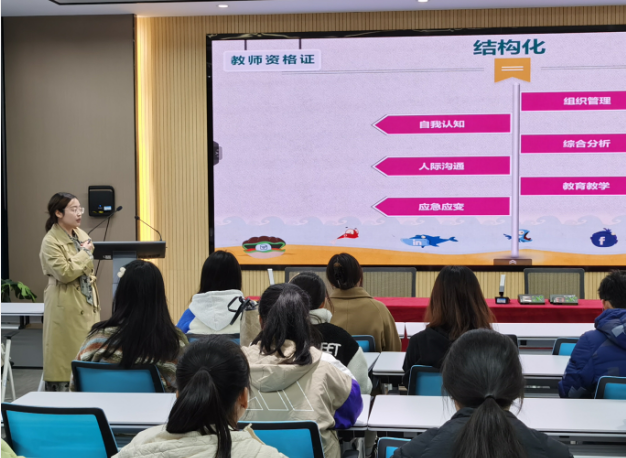 “欢迎大家从事教师职业”。11月17日下午,华图教育金牌讲师付世林与学院60余名想从事教师职业的同学们进行了深入交流。付世林在介绍教师资格证考试的报名条件、报名流程、考试内容后,重点讲解了教师资格面试的相关技巧。从面试流程到评分标准,从礼貌用语到着装仪态,从结构化面试策略到试讲技巧,她不时与现场同学交流互动,帮助大家更好理解讲述的要点内容。除了传授应试技巧,付世林也将“爱国守法”、“爱岗敬业”、“关爱学生”、“ 教书育人”、“ 为人师表”、“终身学习”等教师职业道德要求传递给学生,让同学们了解到要真正成为一名老师需要的不仅仅是专业知识和授课技巧,还需要在“为人”、“为学”等方面为学生做好榜样。