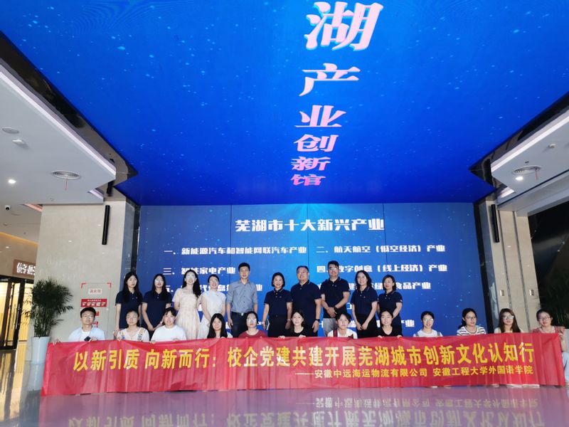 7月3日下午,外国语学院与安徽中远物流有限公司联合开展了“以新引质 向新而行:校企党建共建开展芜湖城市创新文化认知行”主题党日活动。外国语学院党委书记董金权、安徽中远海运物流有限公司总经理张娟出席活动。双方党员、团员代表参加活动。活动在芜湖产业创新馆和外国语学院209会议室开展。