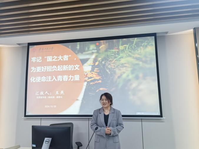 开班仪式结束后,校党委宣传部副部长王燕以《牢记“国之大者”,为更好担负起新的文化使命注入青春力量》为题,给学员们上了精彩的“开班第一讲”。她选用关键词“极端”入题,强调了意识形态工作对于党和国家的重要性;围绕国际环境进行分析,点明了意识形态工作处境的严峻性;引导学员们注意网络安全、增强责任意识,不断提高个人素质,积极支持新时代意识形态工作。
