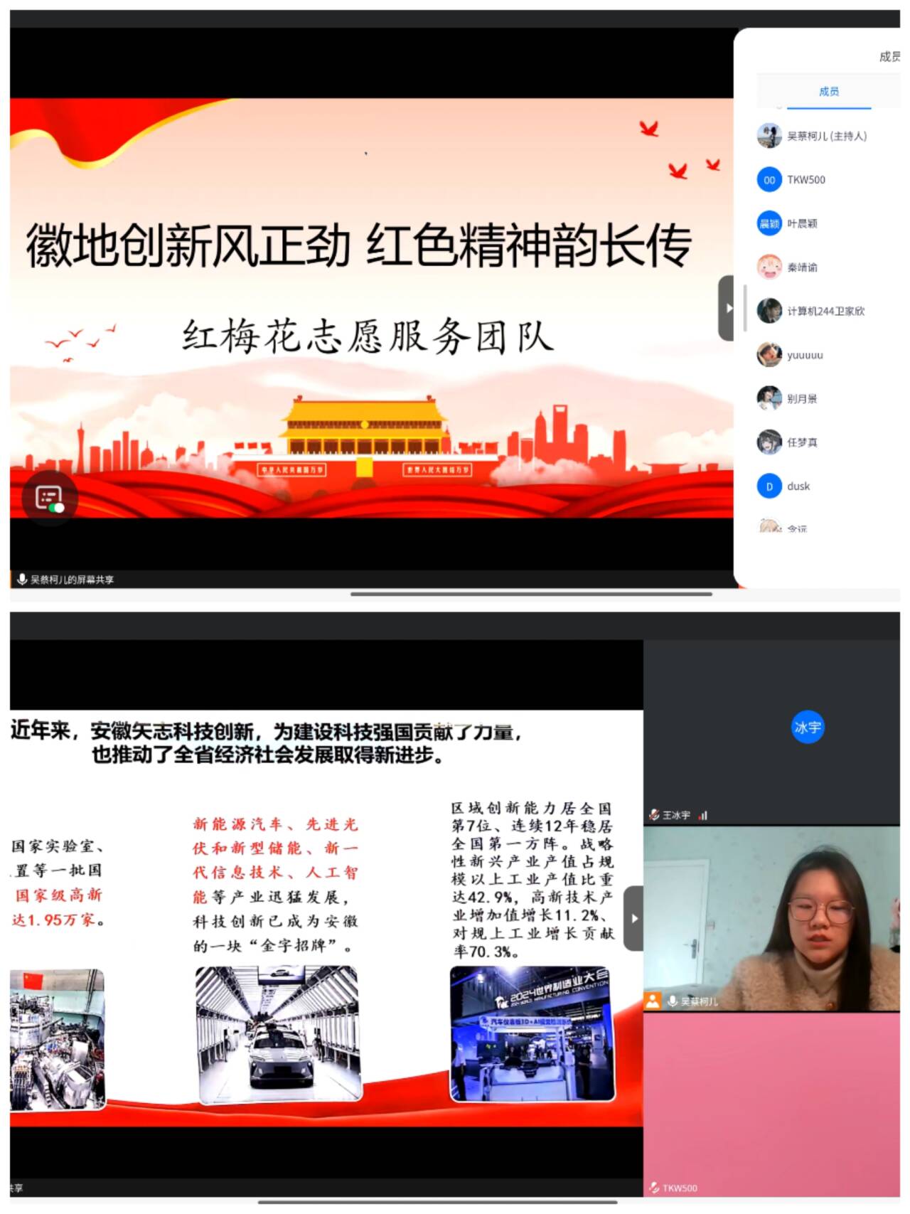 讲好安徽故事,弘扬创新精神。“近年来,安徽弘扬创新精神,大力发展汽车首位产业,取得积极成绩,2024年安徽新能源汽车产量已位居全国第二,其实我们安徽人自古就有敢闯创新的基因。”外国语学院青年宣讲团成员、“红梅花”团队志愿者吴蔡柯儿以安徽汽车产业喜人成绩开场,向50余名青年大学生讲述家乡安徽的创新精神。她结合具体事例,详细介绍了从古至今的安徽人对创新精神的传承与发展。从“徽商精神”的进取意识到“小岗村精神”的敢为人先,从奇瑞汽车的自主研发到科大讯飞在智能语音领域的深耕创新,一个个生动的案例让同学们深刻感受到安徽红色文化与创新精神的蓬勃发展力。